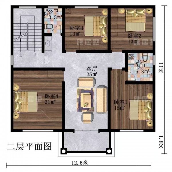 二层 欧式风格尺寸:12.6mx12.8m