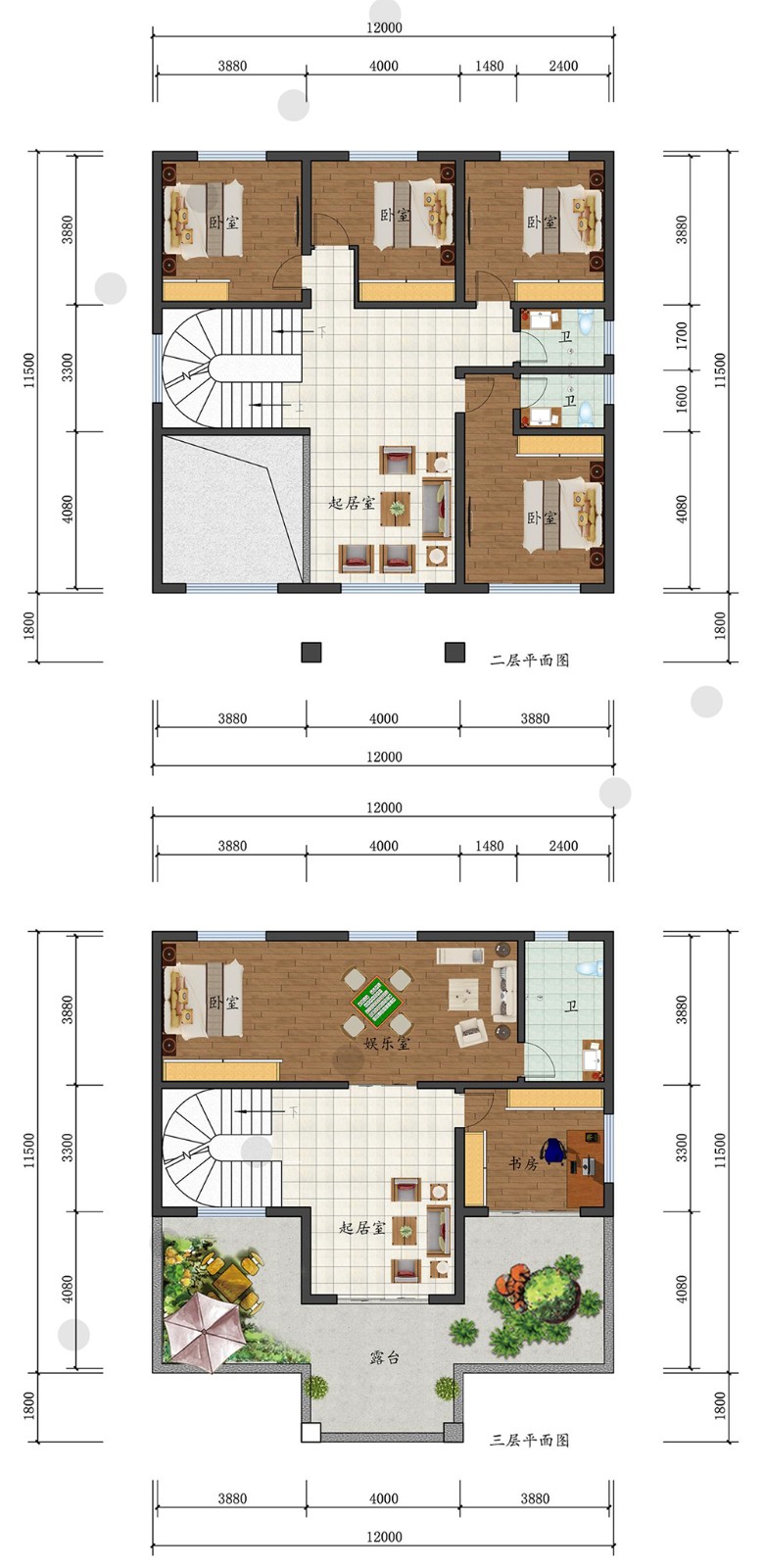 三层新中式带露台旋转楼梯挑空客厅尺寸:12mx11.5m