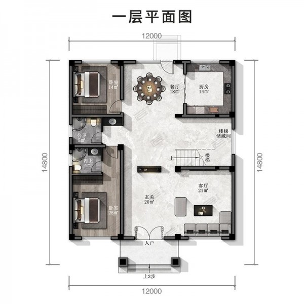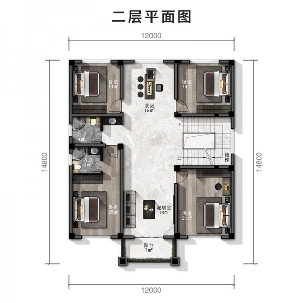 三层新中式风格 尺寸:12mX14.8m